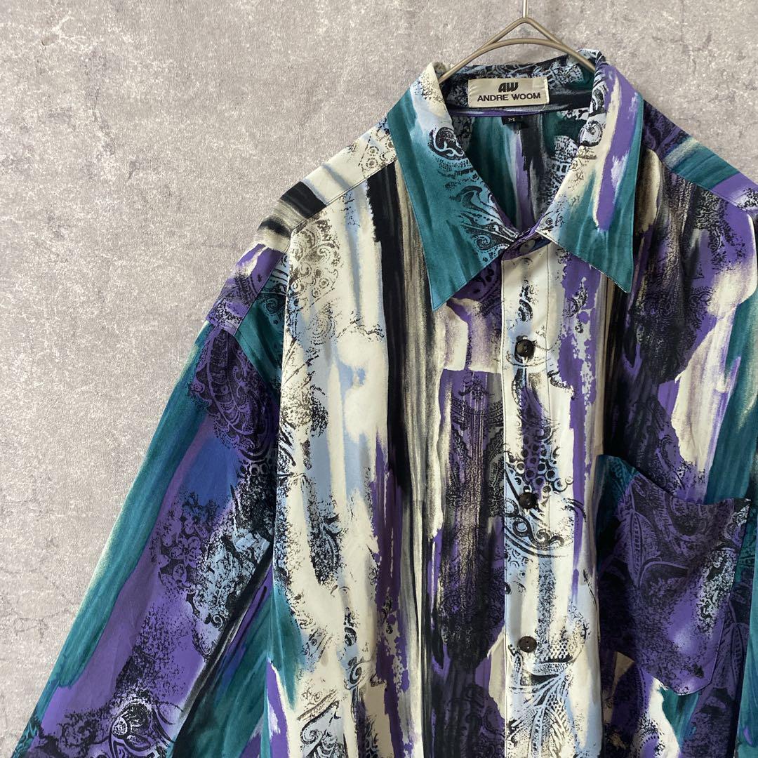 - グラデーションストライプ 柄シャツ 長袖 紫 緑 ゆったりMメンズ