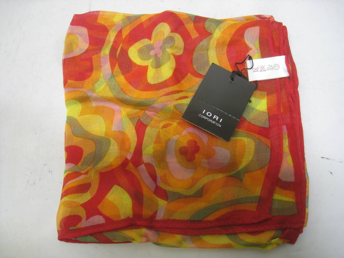 - 新品 定価2500円 IORI 伊織 イオリ シルク100% ハンカチ ハンカチーフ スカーフ 総柄 マルチカラー 赤×黄×オレンジ