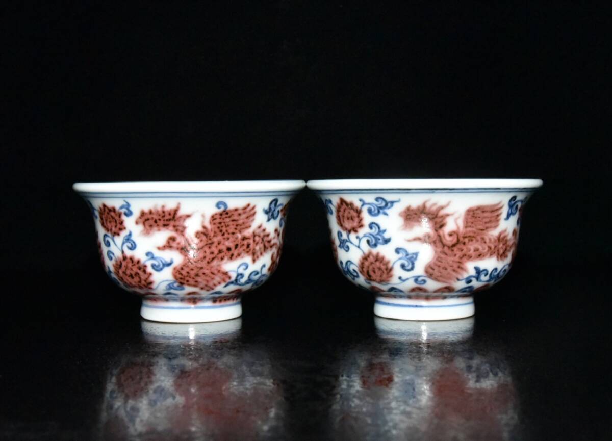 - 【超珍館蔵】明 宣德年製款 古陶瓷品 青花 釉里紅 鳳紋 壓手杯一對 置物 古賞物 古美術品 稀少珍蔵品