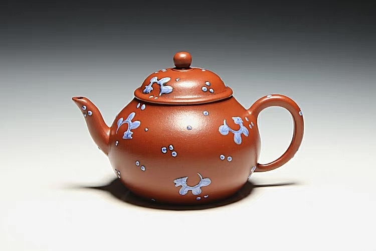 - 【底款 丁亥仲冬日 逸公】 朱泥 紫泥 加藍彩 梨式壺 茶壺 箱付き 茶道具 美術品 陶器工芸