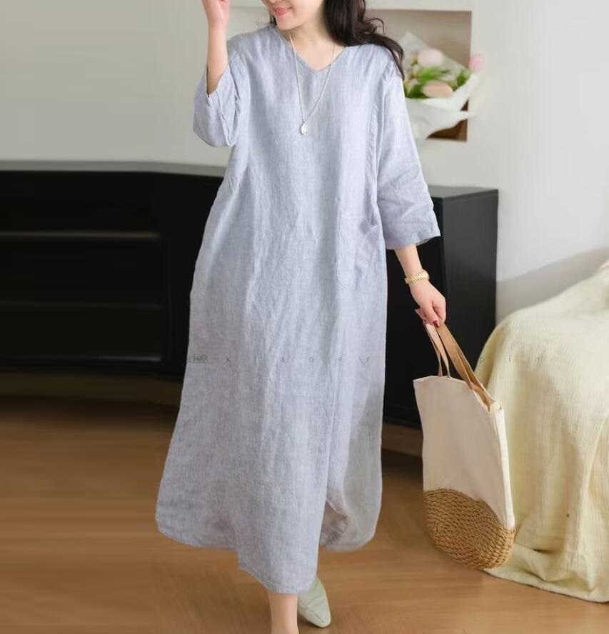 - 夏新入荷*ナチュラル ゆったり 無地 ロングワンピース 綿麻 Vネック 大きいサイズ 長袖 マキシロングワンピース 体型カバー