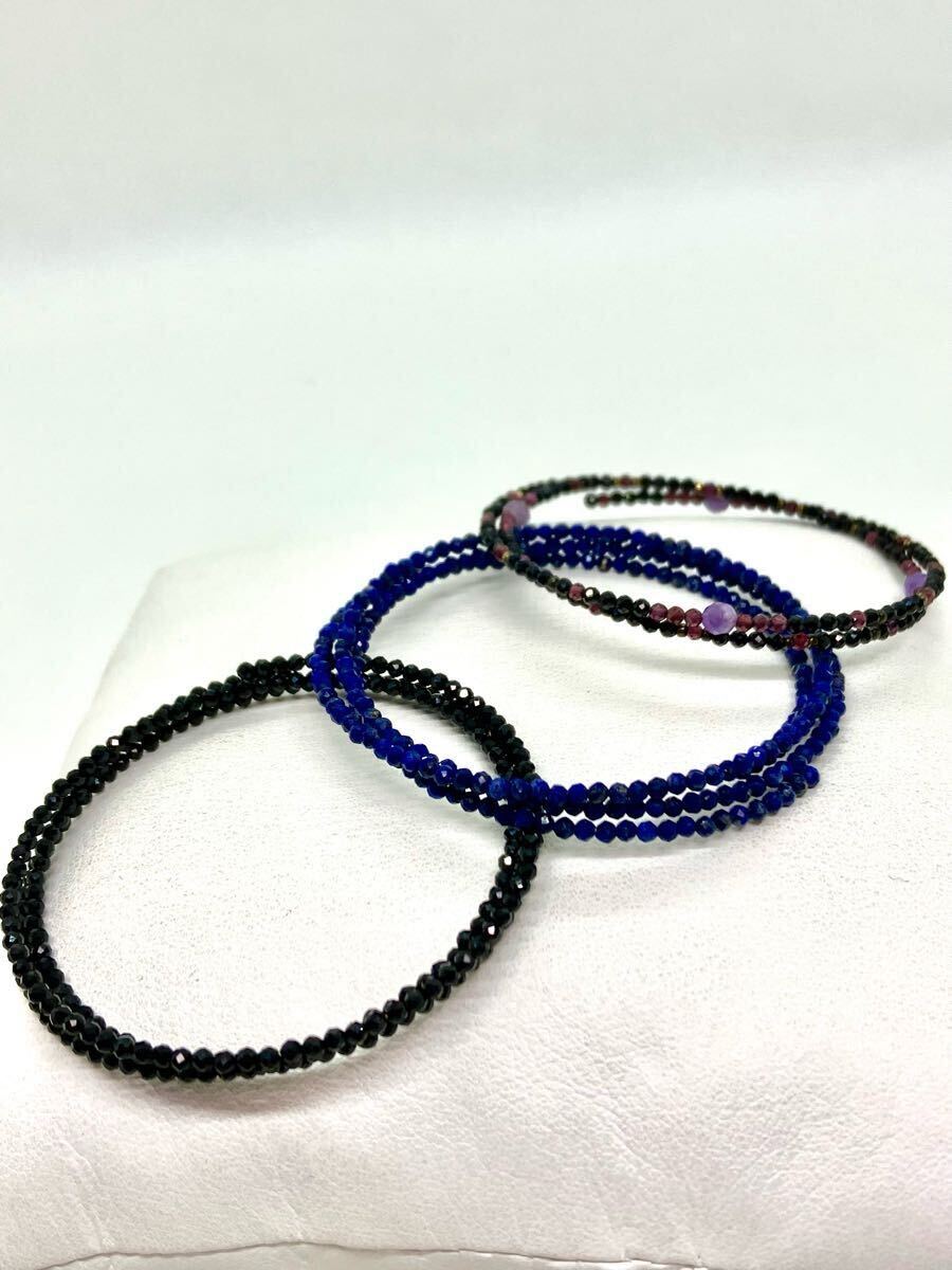 > 【新品】形状記憶ワイヤー天然石フリーサイズブレスレット/ブラックスピネル/ラピスラズリ/アメジスト:ガーネット/三点セット/バングル