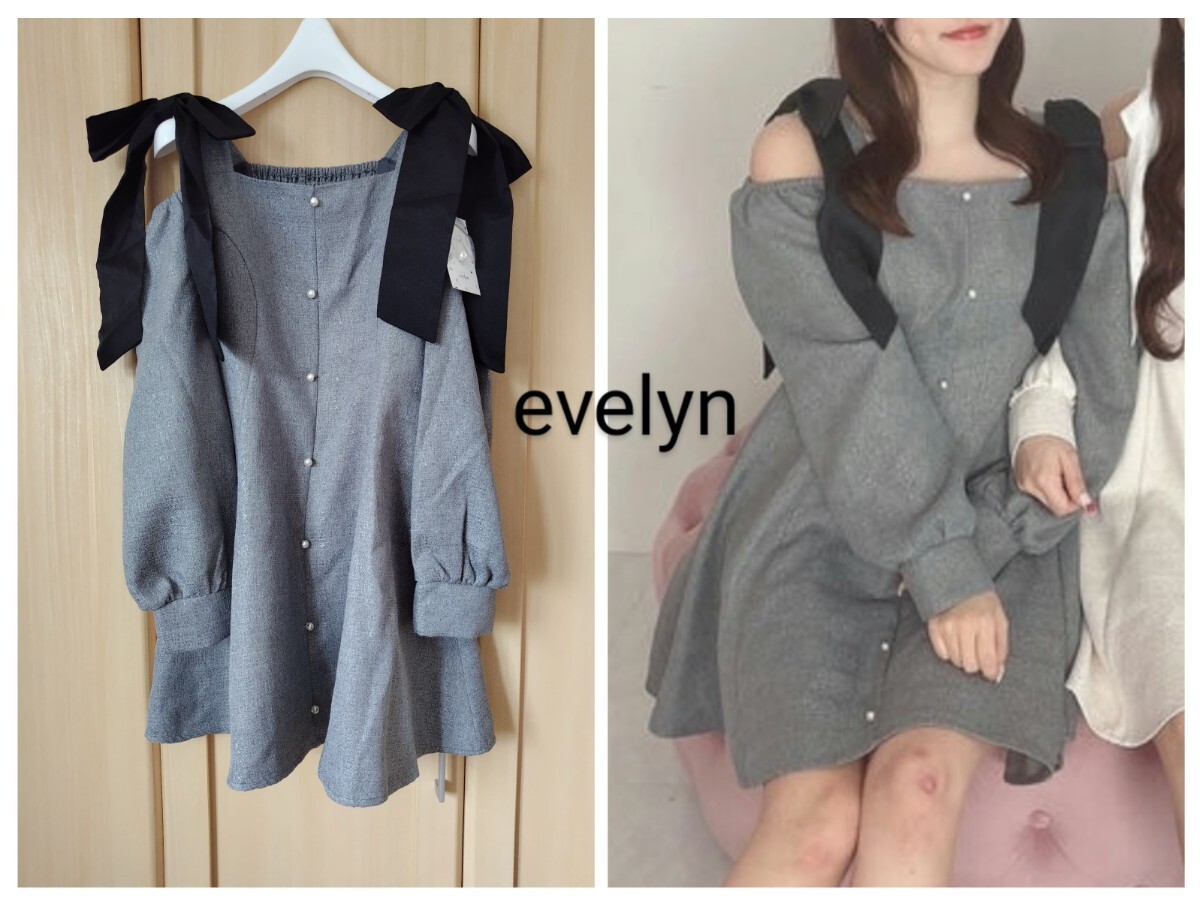- タグ付 EVELYN エブリン 肩リボン ワンピース レディースF グレー 未使用 新品