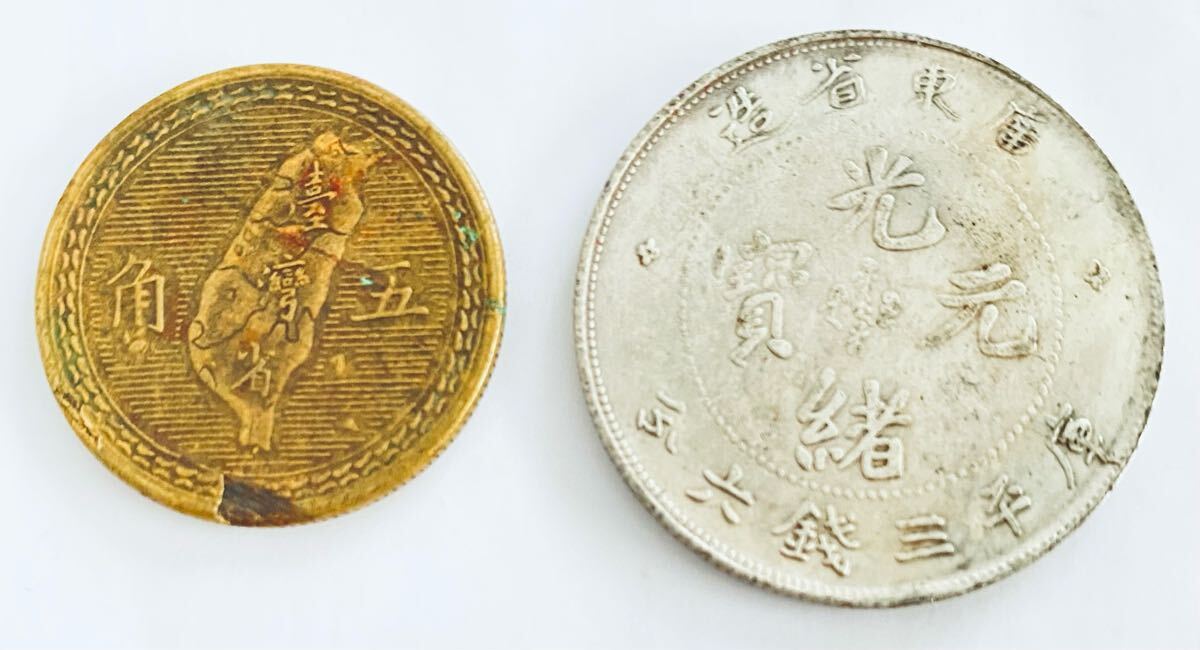 > 海外 古銭 2枚セット:①台湾 五角 中華民国四十三年(1954年)五月二十日 :一部欠け有 ②【レプリカ】中国 広東省造7メイス2カンダリーン