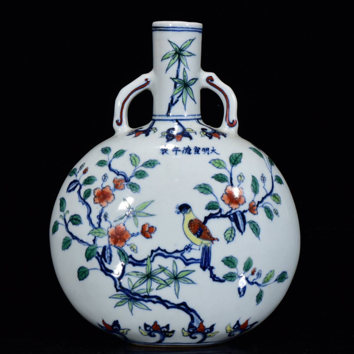 - ▽鴻▽ 明 宣德年製款 斗彩 花鳥紋 扁瓶 古陶瓷品 置物 古賞物 中国古玩 中国古美術