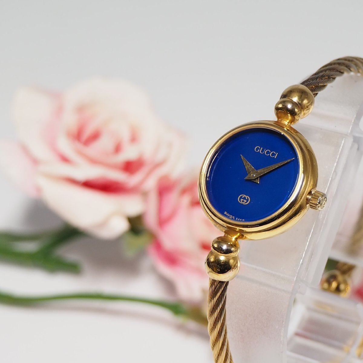 ★★★★ 希少 グッチ GUCCI ワイヤー バングルウォッチ ネイビー文字盤 レディース 腕時計 F608 中古★★★★