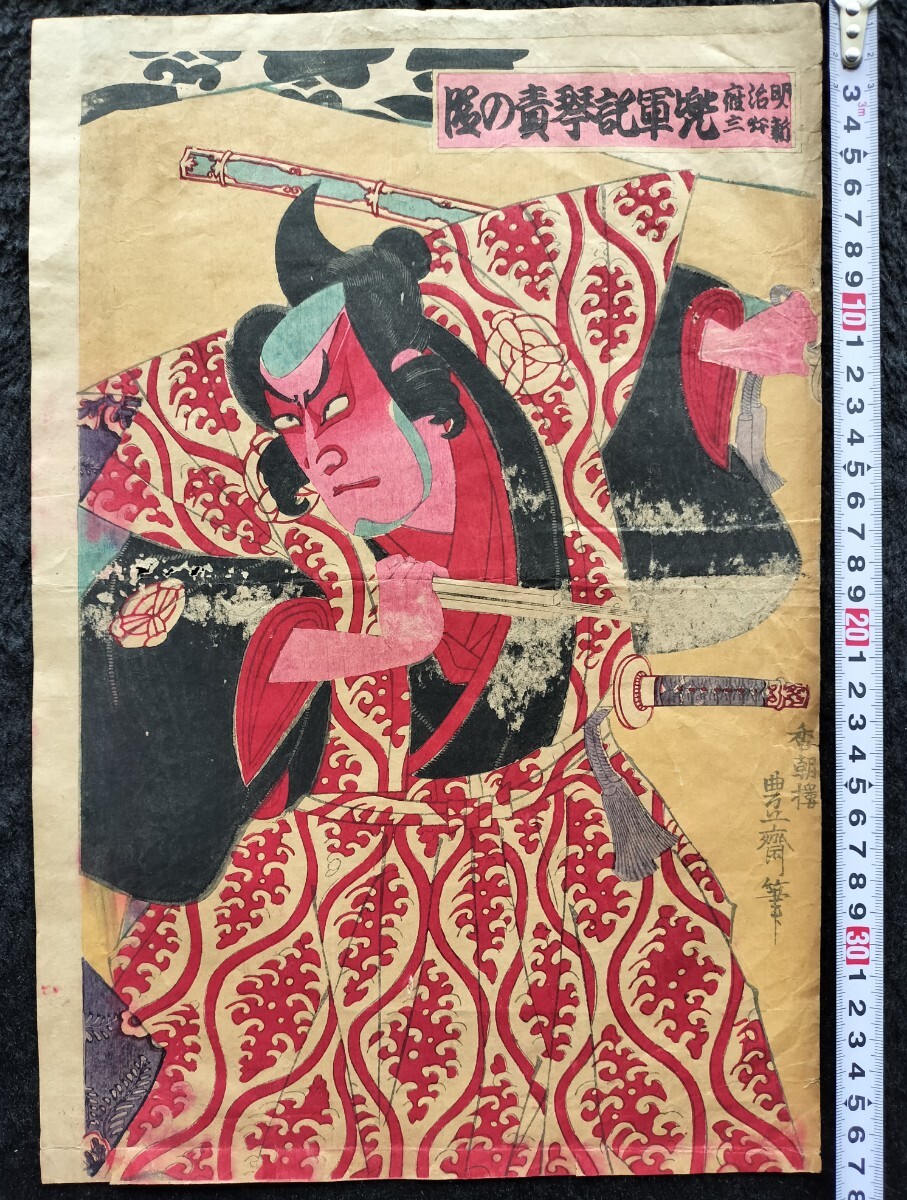 - 【真作】明治期 本物浮世絵木版画 三代国貞「怒れる侍」役者絵 大判 錦絵 保存良い