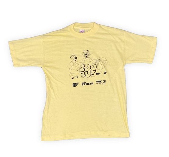 > 80's パキスタン製 TRIANGLE RN68098 ビンテージ Tシャツ ZOO BUS 綿50ポリ50 イエロー S 身幅44 [la-1279]