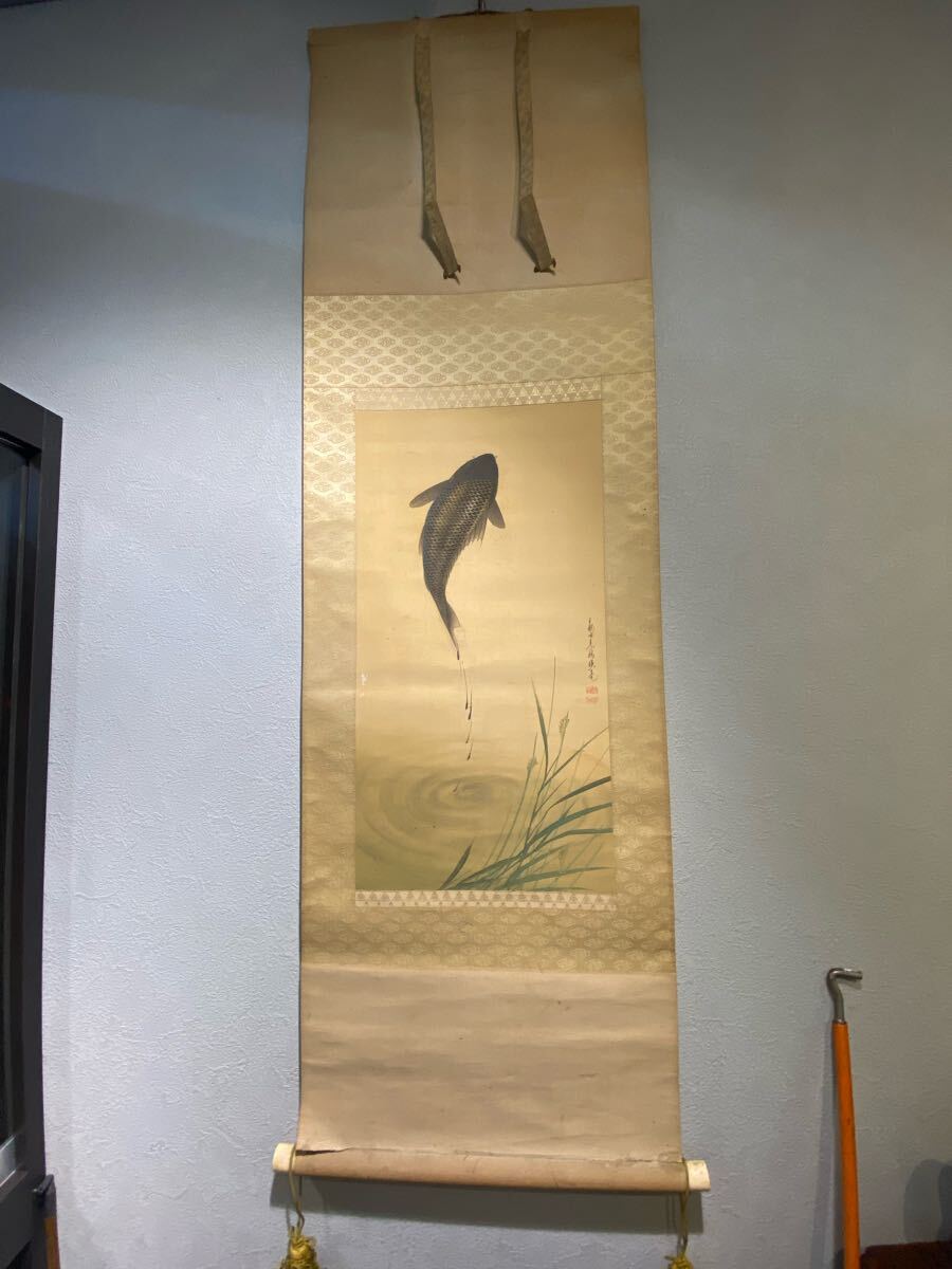 - 日本画 掛け軸 水面を跳ねる鯉 江戸時代後期頃