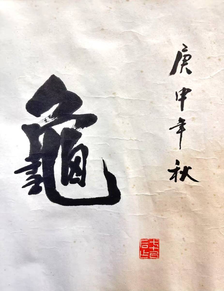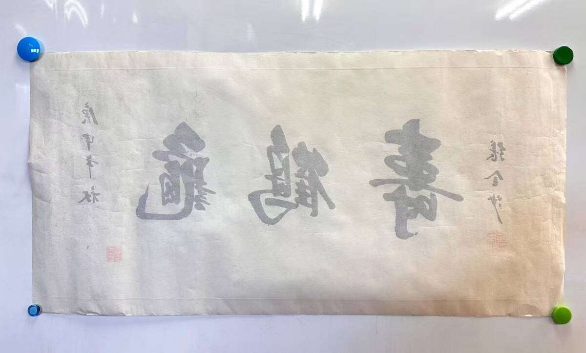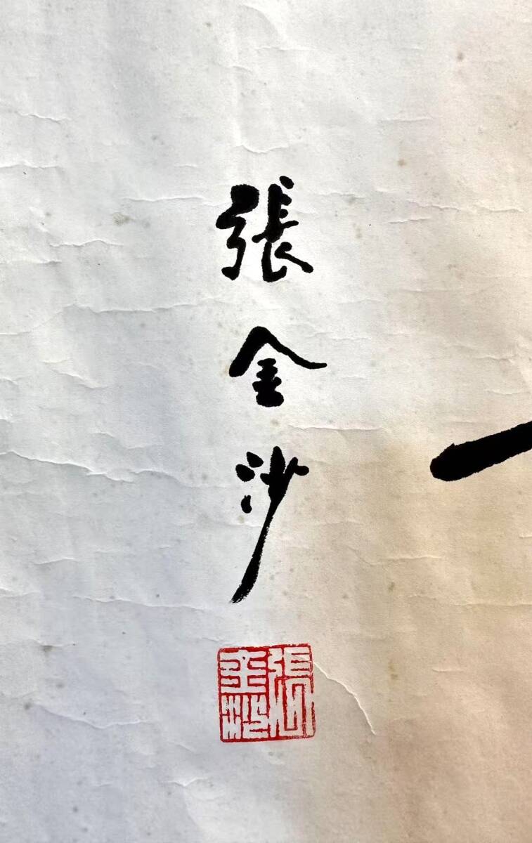 > F107『肉筆』張金沙【亀鶴寿】書 書道 書法 毛筆 紙本 中国美術 掛軸 額 在銘 落款 現状品 サイズ:約89.3㎝ x 44㎝『模写』
