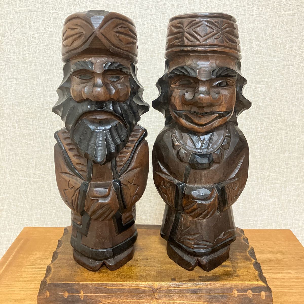 - 当時物 北海道 アイヌ ニポポ人形 高さ30cm 夫婦人形 二体 ペア 置物 オブジェ 木製 木彫り 民芸品 縁起物 インテリア 台座付 アンティーク