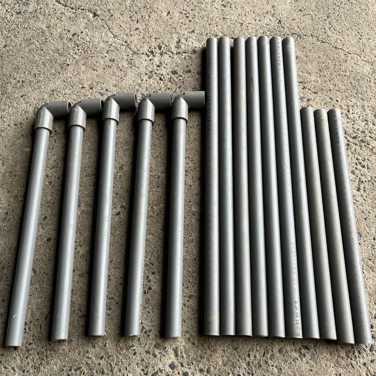 - PVC製のグレーの配管パイプとフィッティングのセット。