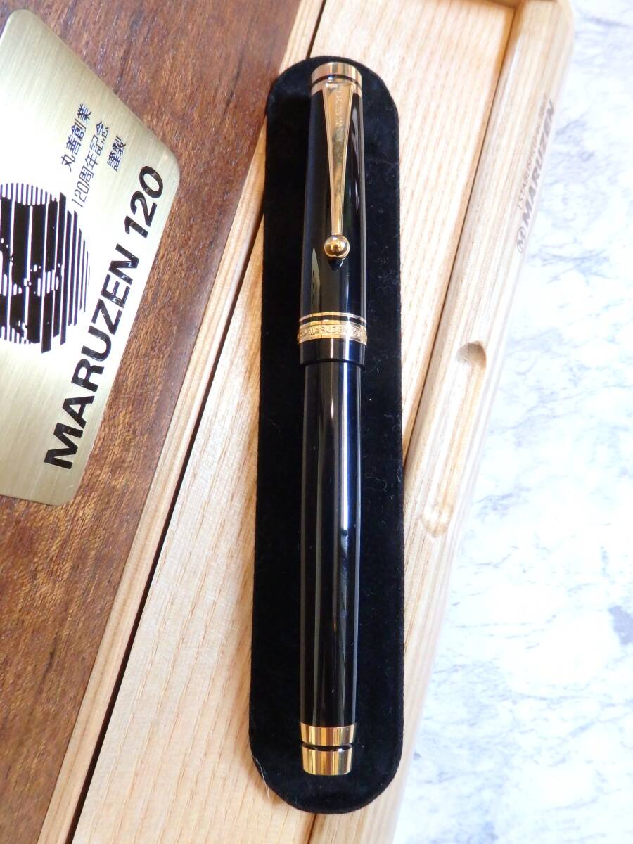 > ◆【ほぼ未使用】【送料410円~】丸善 マルゼン120周年記念 エボナイト削り出し手作り万年筆 ペン先:14K585ソリッドゴールド M 箱付き