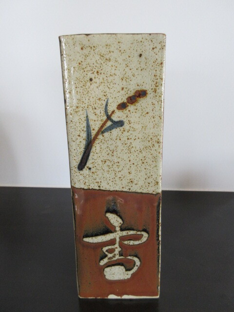 - 益子焼 方形花瓶 柿赤釉 雪月風花 高さ32.5cm 縦横10.5cm