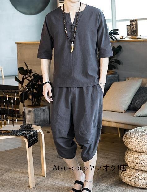 - メンズ Tシャツ 綿麻トップス ハーフ ショート パンツ 上下 セット アップ 部屋着 無地