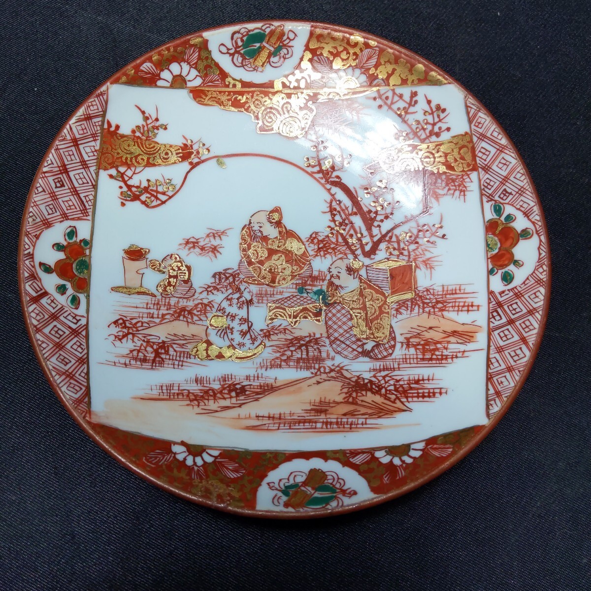 - 481 九谷 赤絵 骨董 古美術 時代物 直径 19cm 色絵 飾皿 金彩