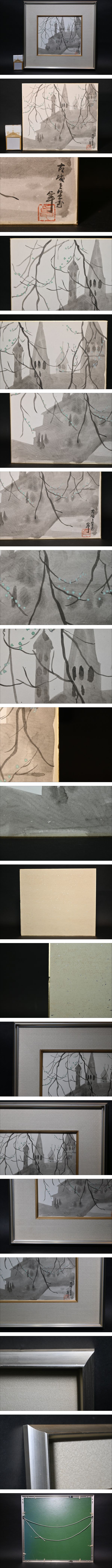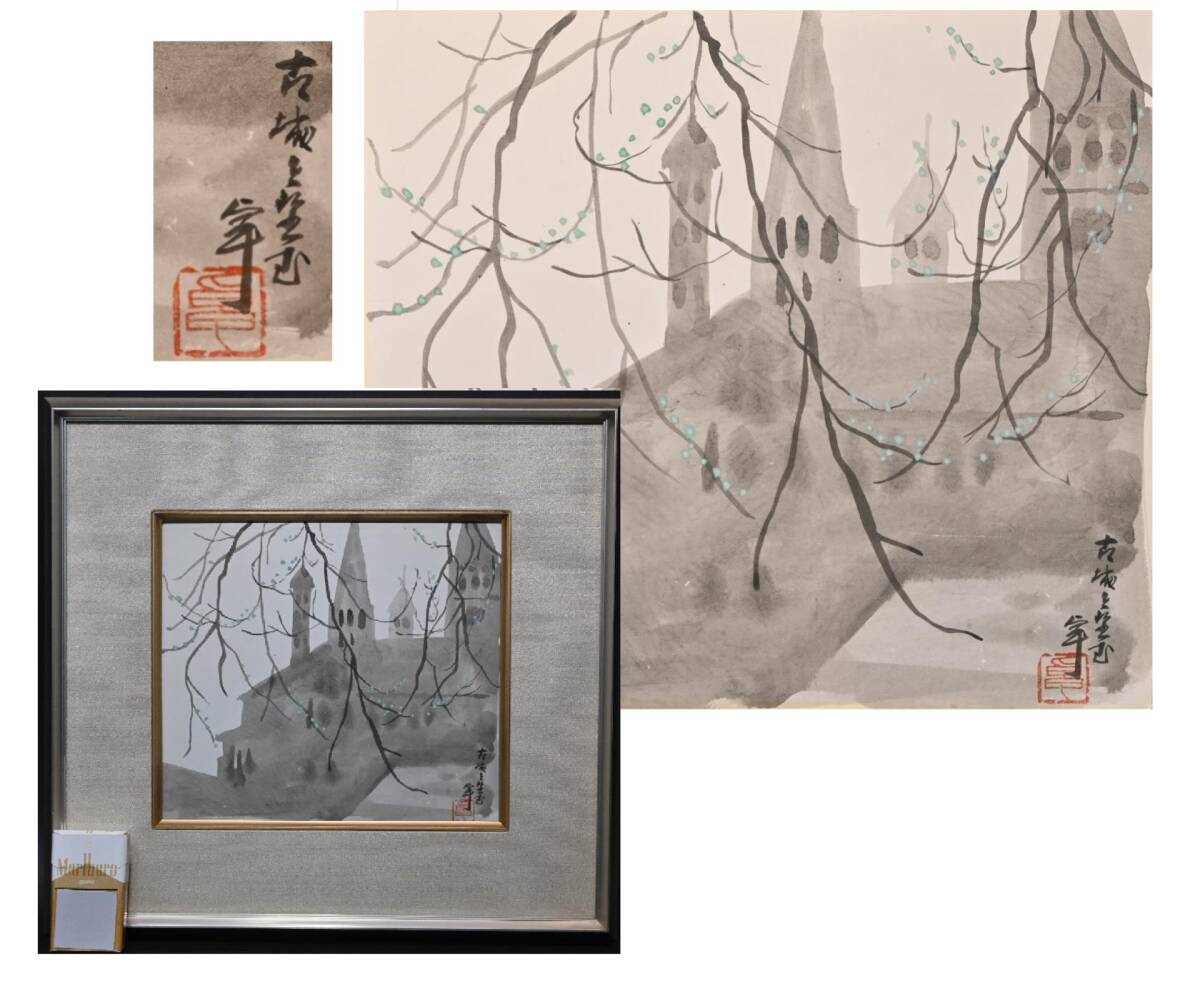 > 真贋保証■人間国宝 加藤卓男■ 水彩『古城を望む』色紙画 肉筆 額装 岐阜県名誉市民 多治見市生 色紙額 色紙絵 風景画 お城