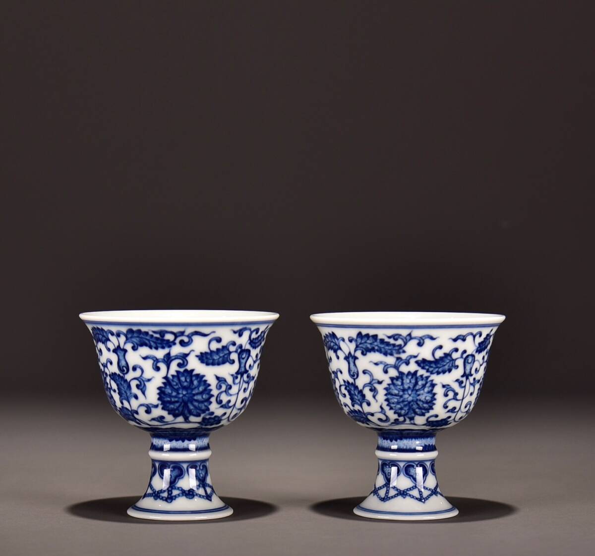 - 【超珍館蔵】清 雍正年製款 古陶瓷品 青花 纏枝牡丹紋 高足杯一對 置物 古賞物 古美術品 稀少珍蔵品