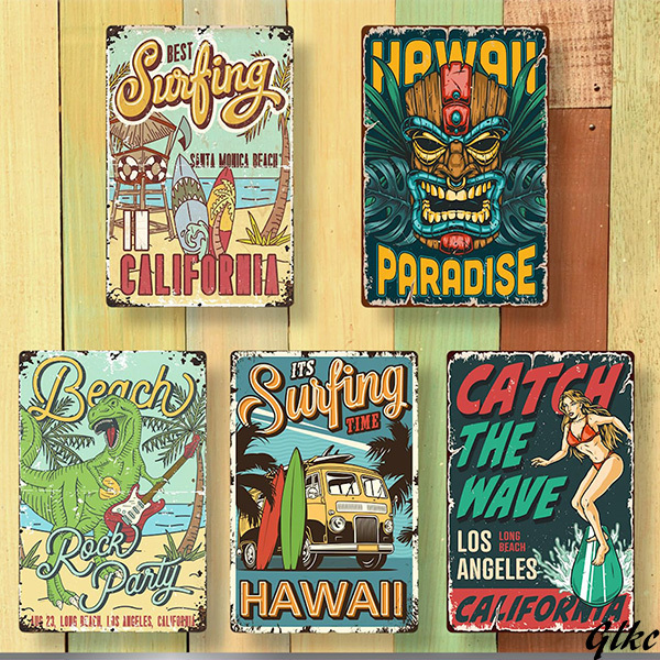 - 【サーフビーチ風ヴィンテージプレート5枚セット】 アメリカ雑貨 20cm×30cm レトロ 看板 おしゃれ ディスプレイ SURF2