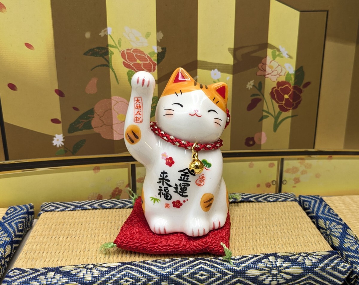- 縁起物 招き猫 陶器 彩絵 招福開運招き猫 鈴付 小 右手上げ