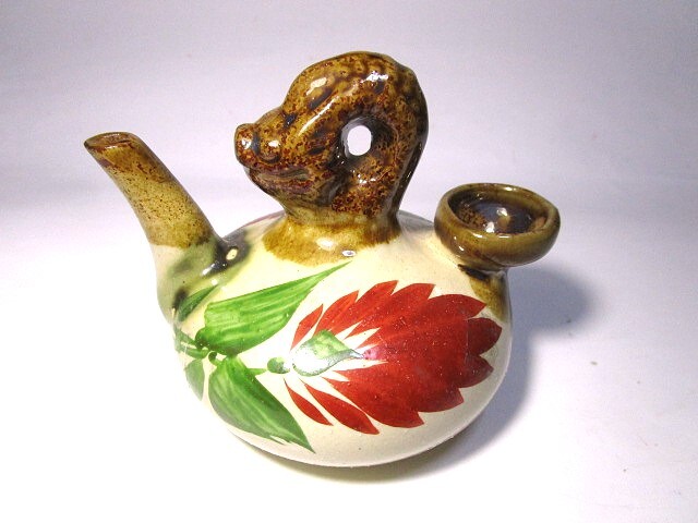 > アンティーク 美品★カラカラ 赤絵 琉球 やちむん 小ぶり 龍頭 三彩 壺屋焼 酒器 焼き物 水差し 1個★