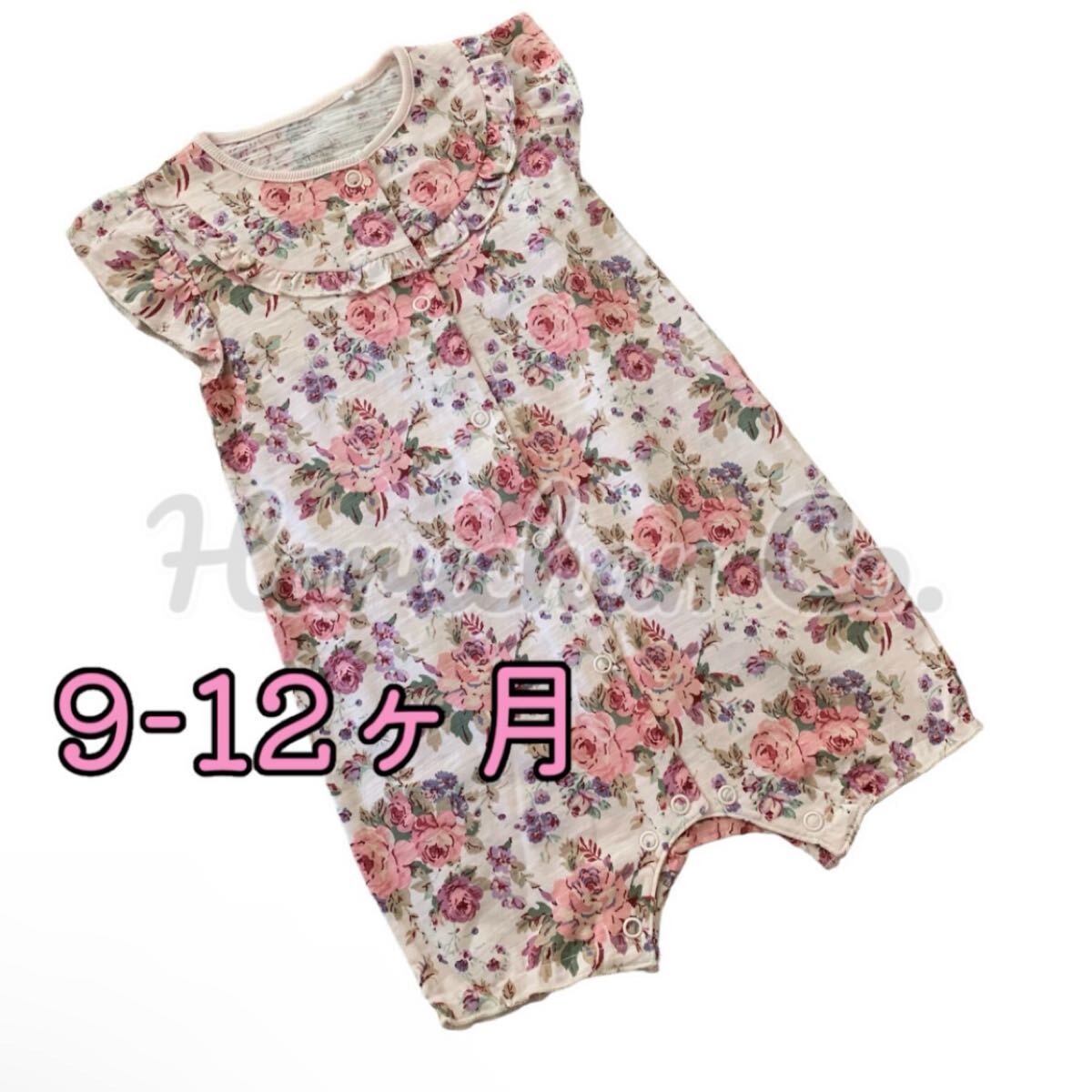 - ●未使用●9-12ヶ月 ベビーピンク ローズ柄 フリル袖ロンパース