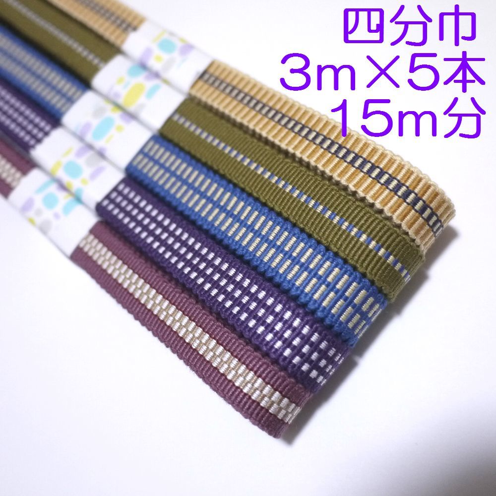 > 四分紐 四分巾 3m 5本セット 国内産 木綿 真田紐 綿100% 紫・青・カーキ・からし色 Samurai ribbon(Sanadahimo)