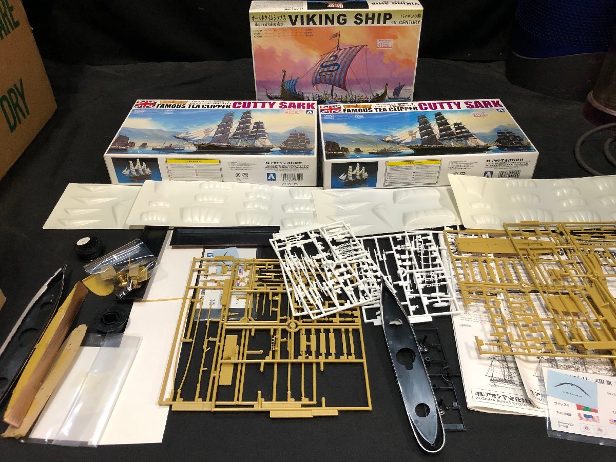 > 25B023 送料無料プラモデル イギリスクリッパー型貨物船 カティサーク バイキング船アオシマ まとめ売り3点 未組立 パーツ部分売り