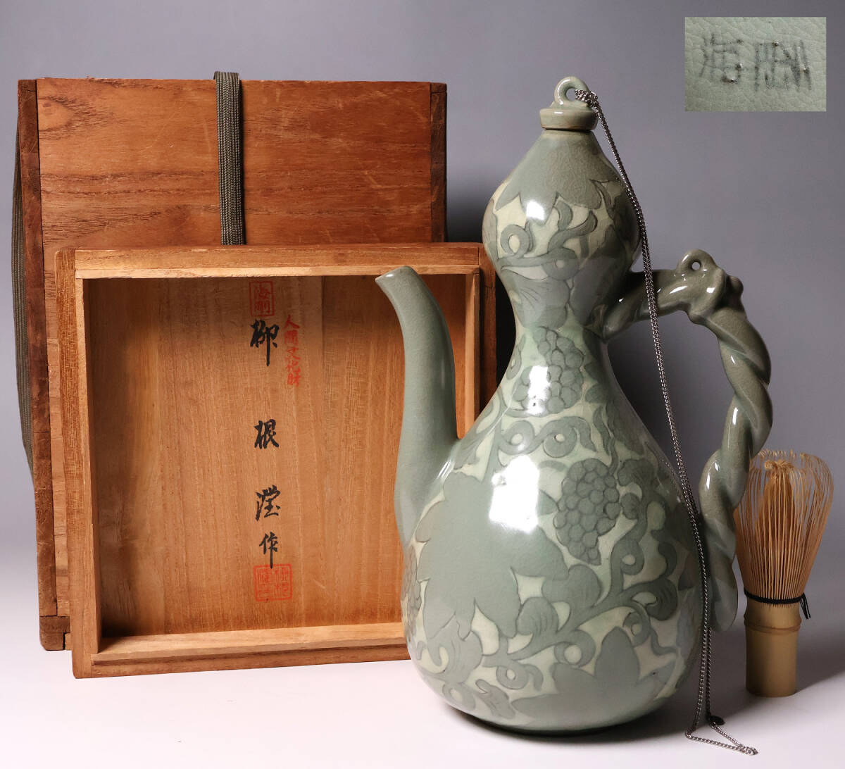 - 韓国人間国宝 海剛(柳根瀅) 高麗青磁 葡萄文 瓢形水注 茶道具 陶芸 柳海剛【MA594】