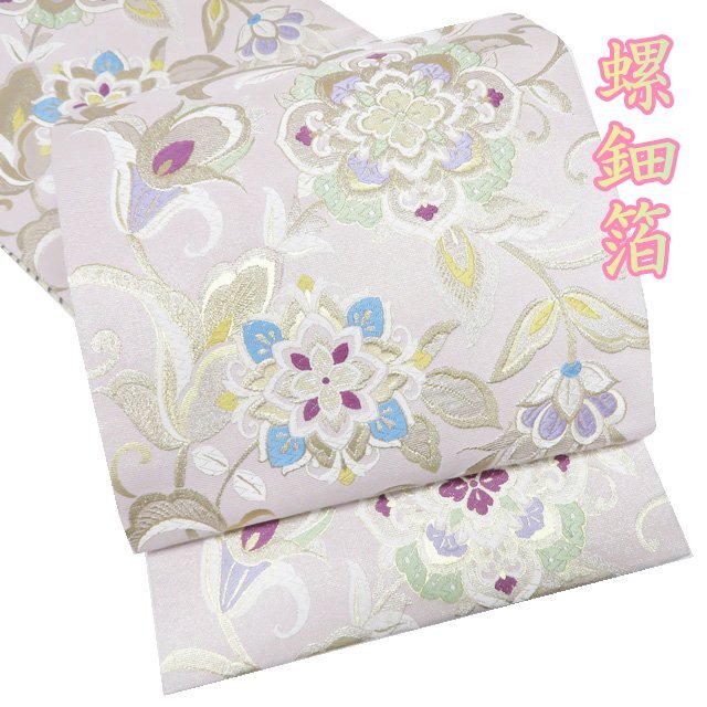 > 特選 袋帯 中古 リサイクル 正絹 フォーマル 全通 輪奈螺鈿織 螺鈿箔 花模様 反端付き 銀通し 薄桜色 多色 金銀 きもの北條 A1189-13