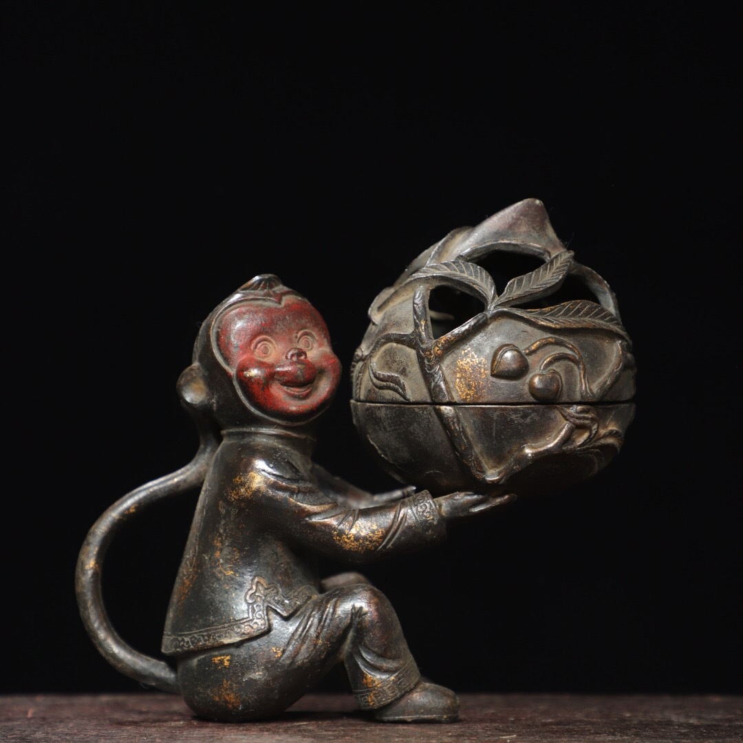 - 蔵友旧蔵出 銅製 拓金 猴子獻壽 熏香爐 密宗密教 供養品 仏教美術品