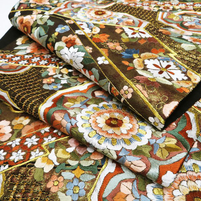 - 袋帯 中古 リサイクル 汕頭刺繍 スワトウ 蘇州刺繍 中国三大刺繍 花模様 箔糸 六通 正絹 フォーマル 多色 金 きもの北條 T749-13