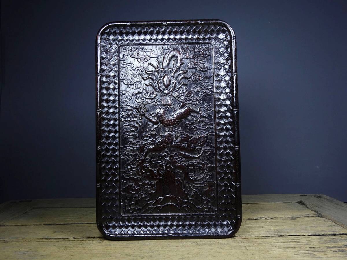 - ▽鴻▽ 檀木製 細密彫 神龍獻瑞紋 茶盤 置物 賞物 古賞物 中国古玩 中国古美術