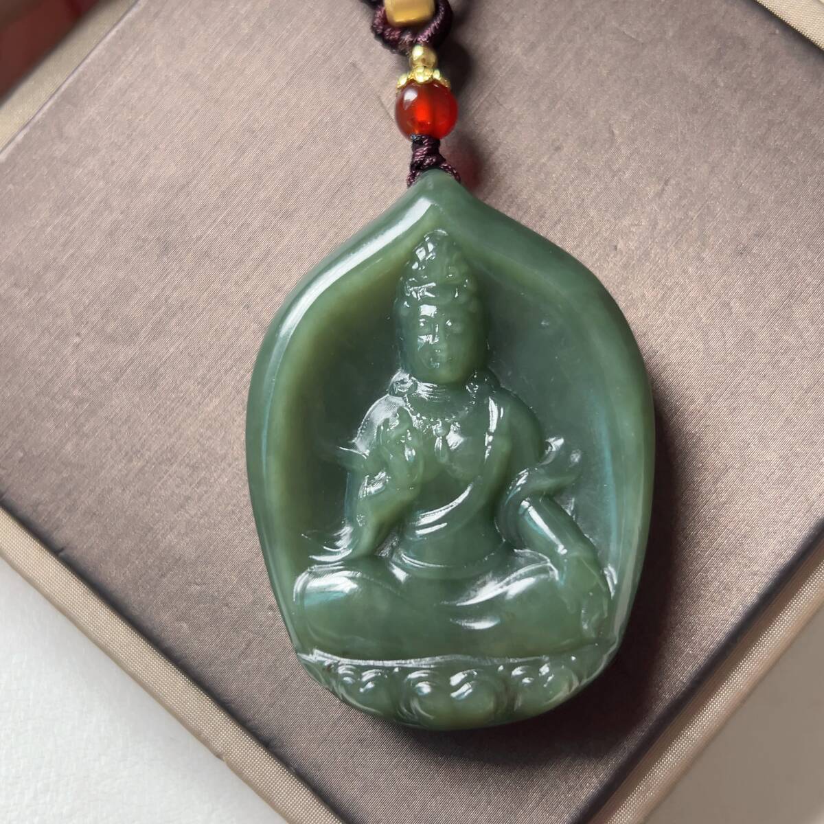> ◇和田玉◇ヒスイ◇ネックレス◇ペンダント◇蓮花+観音形彫刻◇お守り◇天然石◇パワーストーン◇巾着袋付◇プレゼントに037P51618
