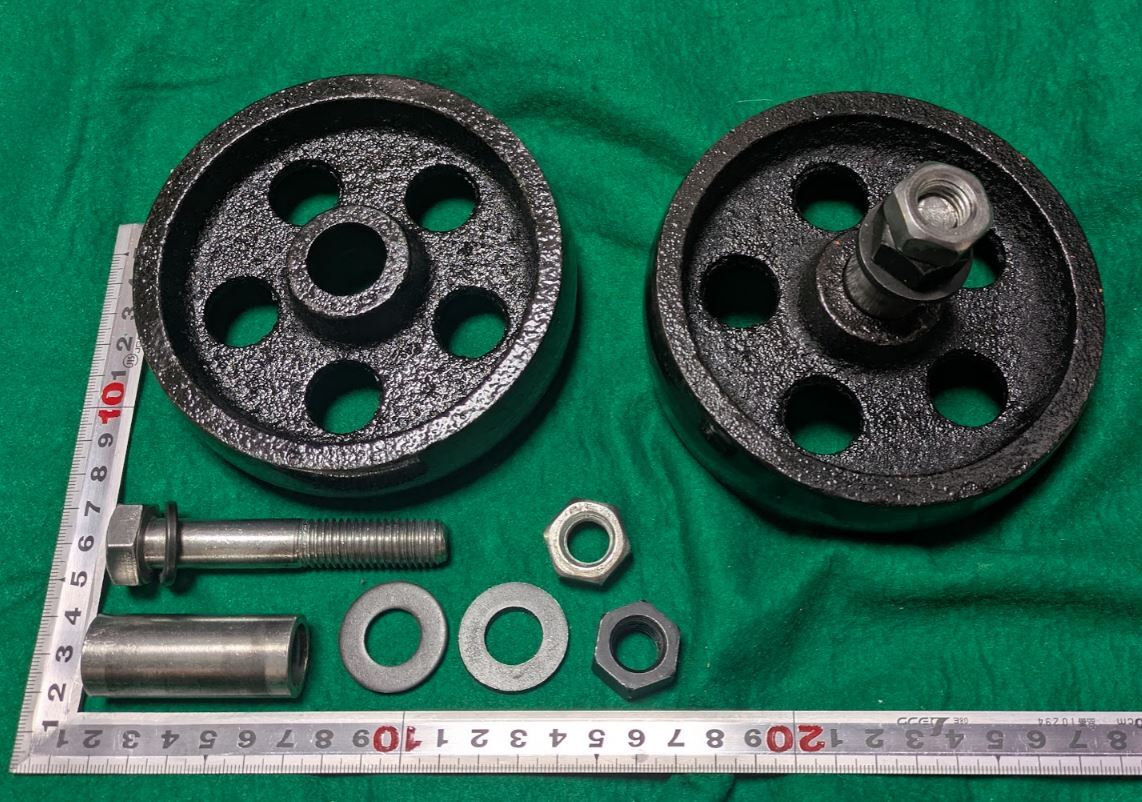 - 【中古・送料無料】2個セット! 鋼製(鋳物)車輪(径:120mm 幅:35mm 軸:M14スリーブ付き)鉄製車輪(トローリーテーブルなどに)