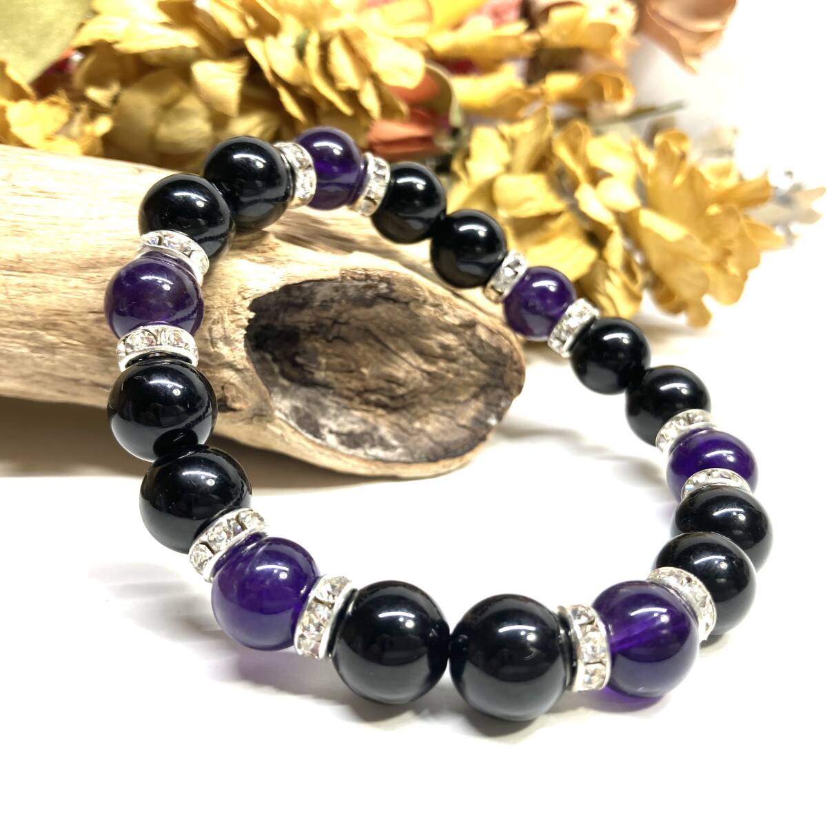 > モリオン&アメジスト パワーストーン ブレスレット 天然石ブレス (シルバー) 10mm メンズ・レディース 厄除け 恋愛運 ☆