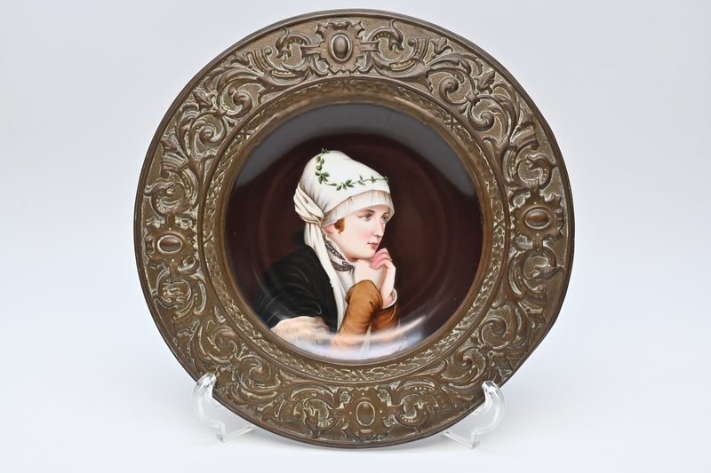> 西洋 飾皿 ■ 手描 ポートレートプレート [肖像画 ] 若い女性 ■ エンボス金属額縁 アンティーク 西洋美術 ■