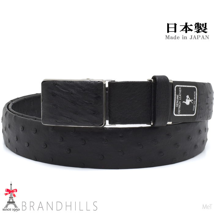 - オーストリッチ ベルト 幅35mm 本無双 メンズ ブラック 紳士用 スライド式バックル 黒色 日本製 新品