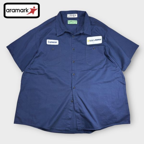 - ★BIGサイズ★U.S.LAWNSロゴ★aramark 半袖ワークシャツ size3XL ネイビー系 COTTON100% 古着 クリーニング プレス済み 2170