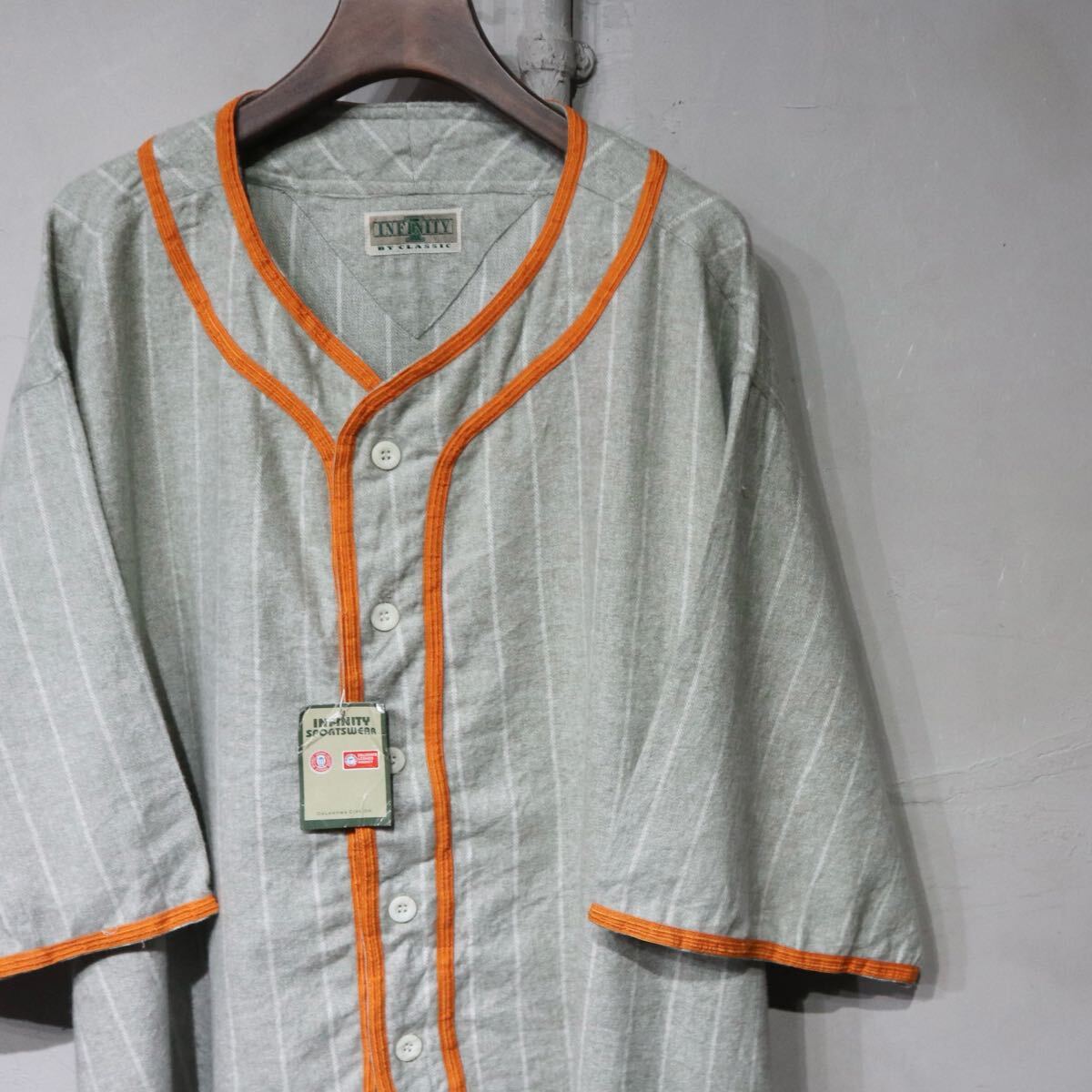 > 【即決】INFINITY インフィニティ ベースボールシャツ 半袖 パイピング オレンジ グレー ストライプ 古着 2XL deadstock デッドストック
