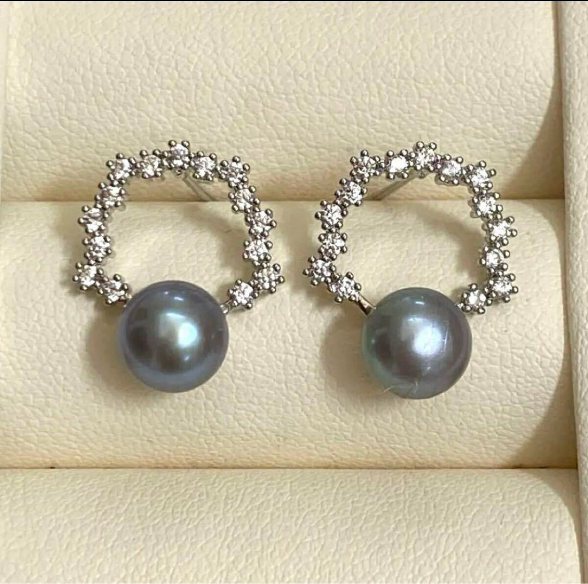 - おしゃれ真珠ピアス キラキラCZ付き グリーン系グレー 7.5-8mm