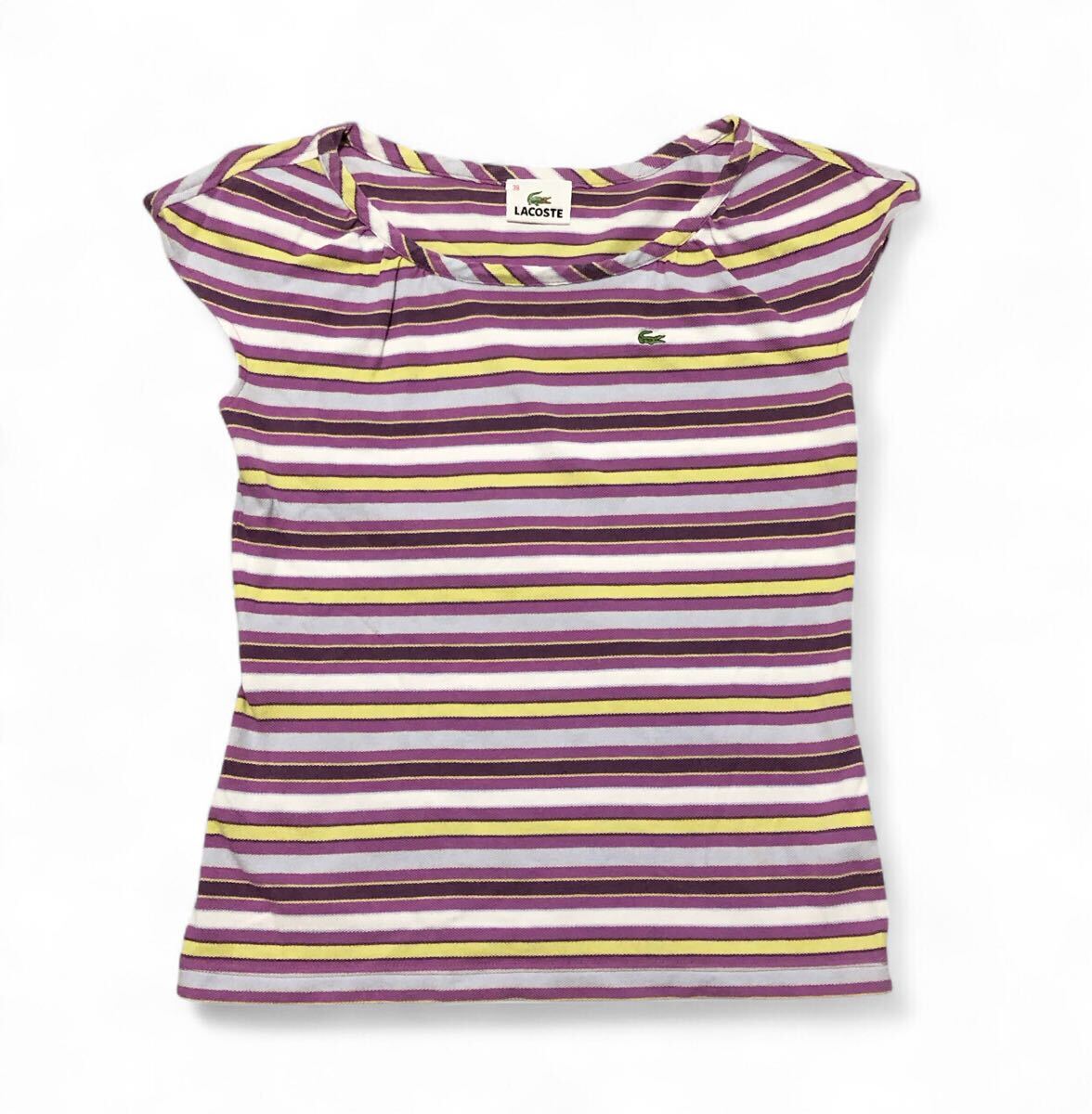 > ■LACOSTE ラコステ■ワニ刺繍 ボーダー柄 キャップスリーブ カットソー パープル系 38