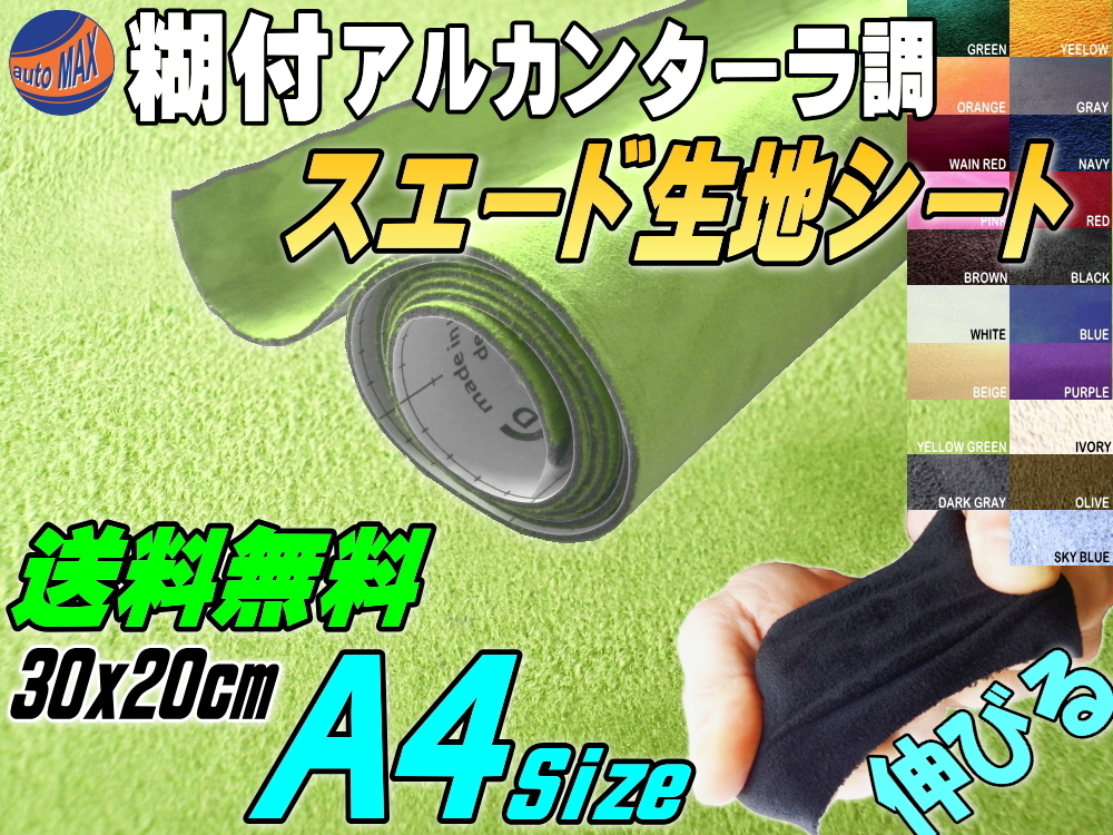 > スエード (A4) 黄緑 30cm×20cm伸びるアルカンターラ調スウェード生地スエードシート裏面糊付きカッティング可 シート内装ドアパネル車 0
