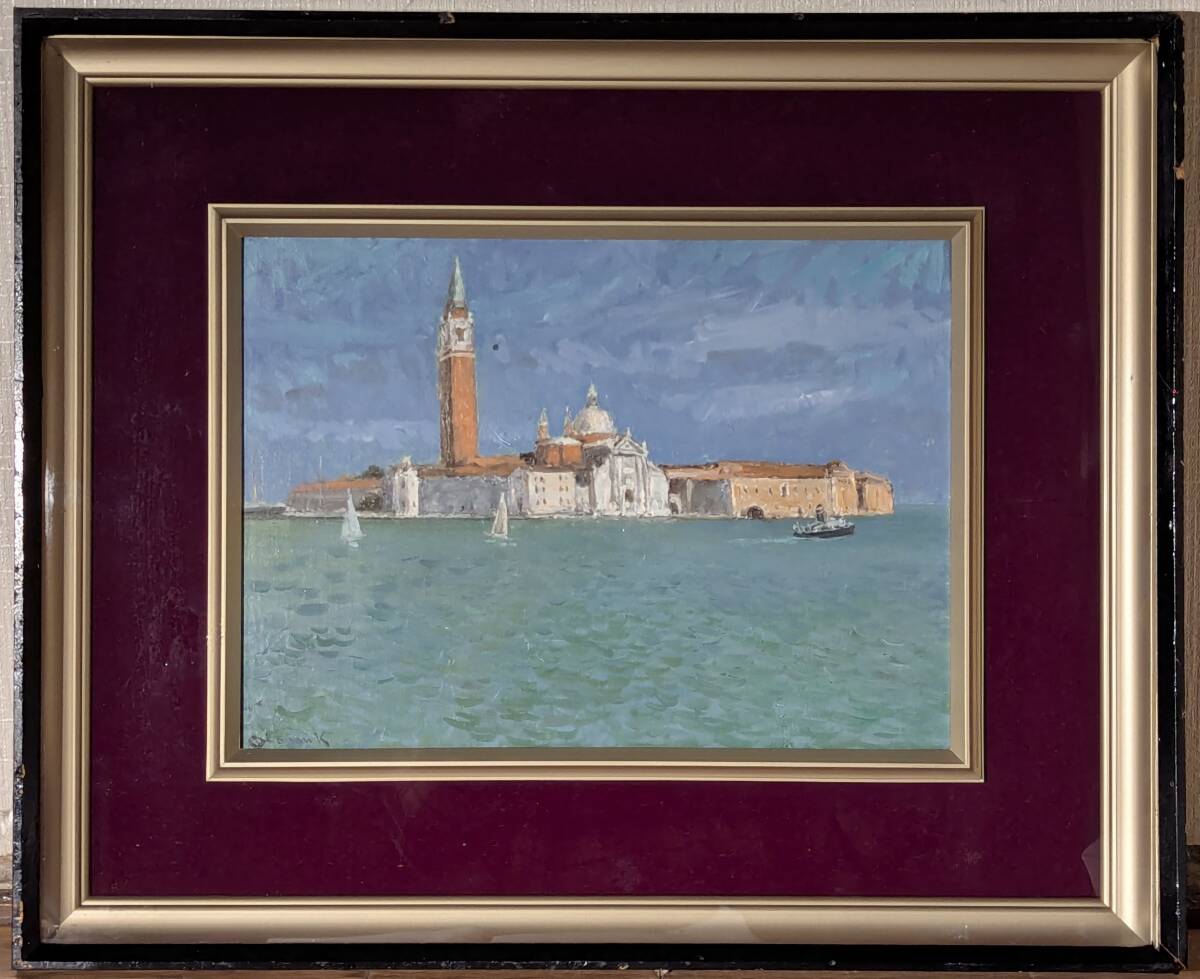 - 【真作】絵画 油彩4号 ベニス風景 ヴェネツィア風景画 海と教会の風景 X27