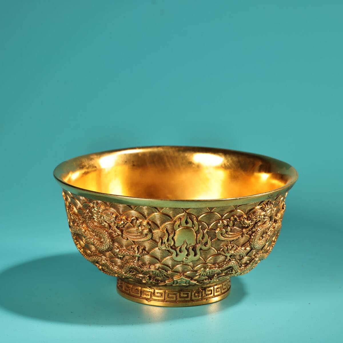 - 蔵友旧蔵出 銅製 塗金 神龍紋 供碗 貴重品 置物 古賞物 中国古玩 中国古美術品