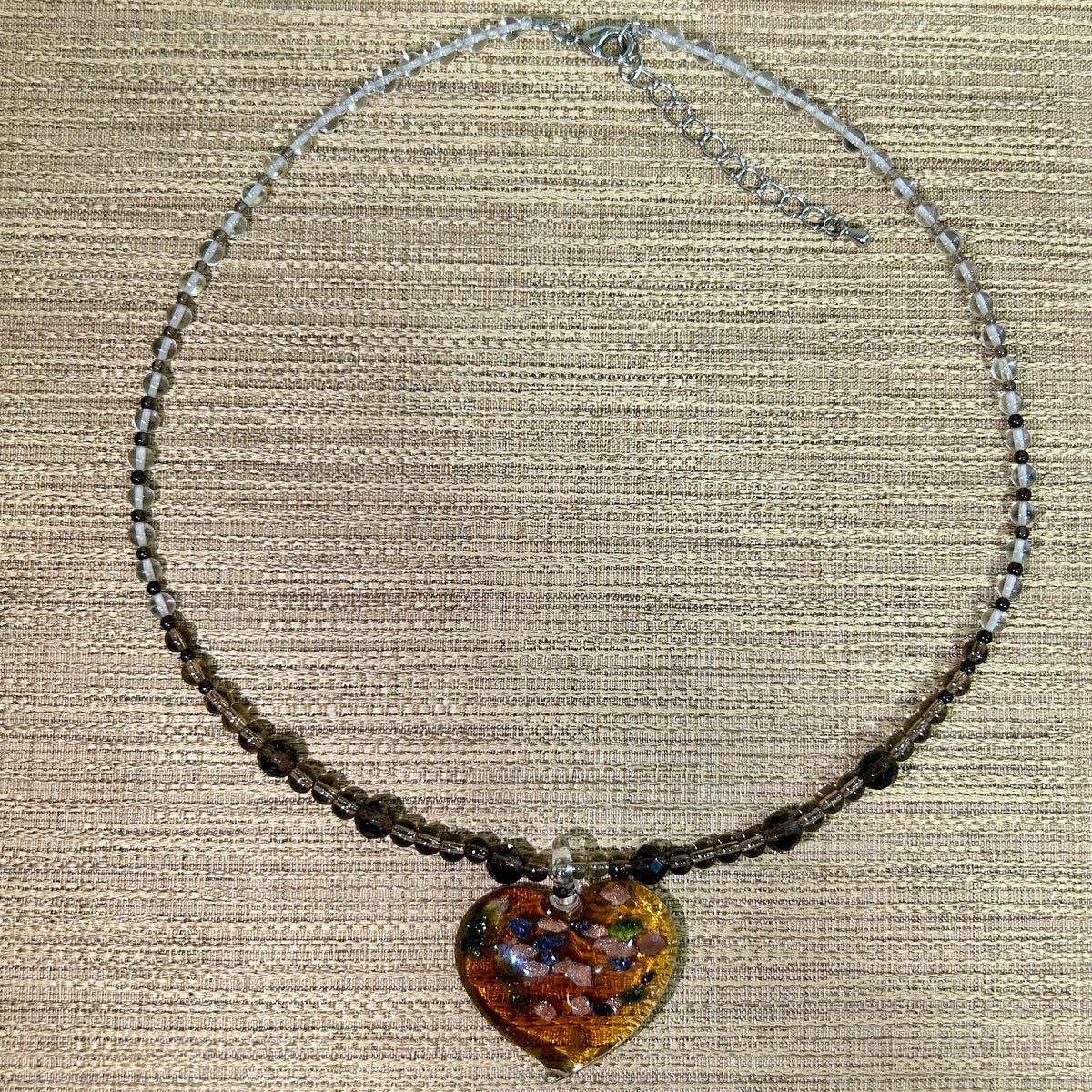 - 【新品】天然石×トンボ玉ペンダント★水晶 スモーキークォーツ ネックレス アクセサリー ハート ペンダントトップ ガラス ブラウン