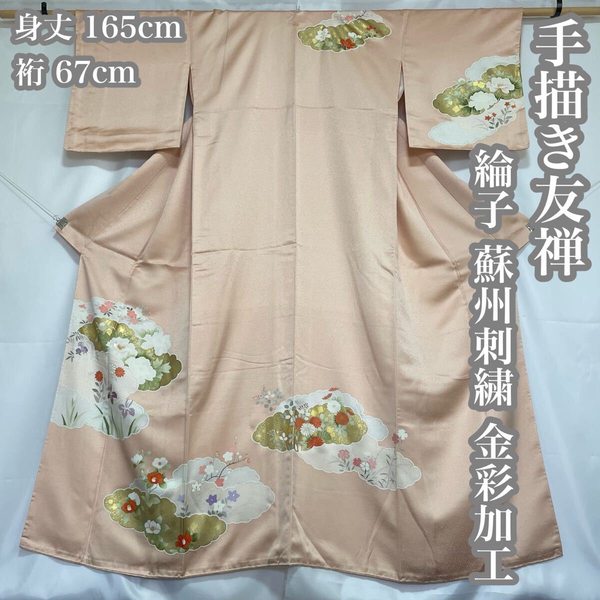 - #H057 訪問着 手描き友禅 綸子 蘇州刺繍 金彩加工 牡丹 椿 正絹 身丈165cm 67cm 刺繍紋 和装 和服 着物【wellriver】