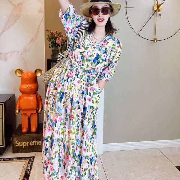 - mc 0705 半袖 ポケット ワンピース ゆったり オシャレ 裾広がる 通気性手触り抜群 肌に優しい ドレープ性 大人可愛 着丈120㎝ 柄64