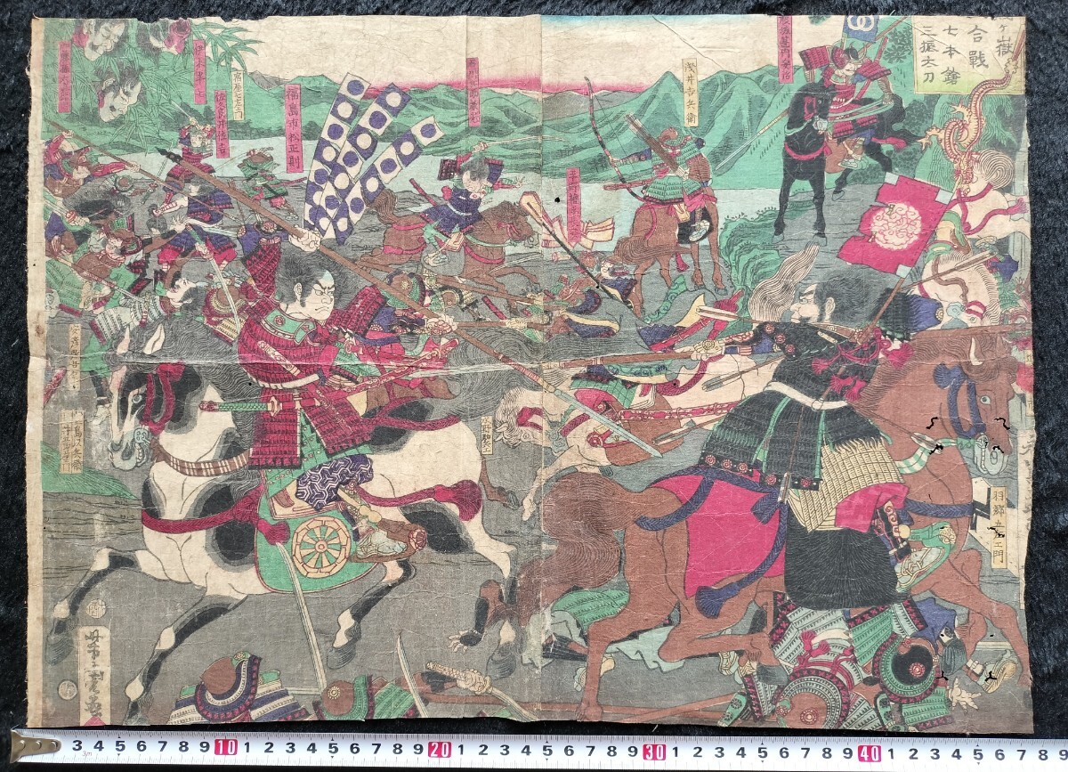 > 生首!江戸期/真作 歌川芳虎「賤ヶ嶽大合戦 七本鎗 三振太刀」本物浮世絵木版画 武者絵 錦絵 大判 二枚続き 裏打ち