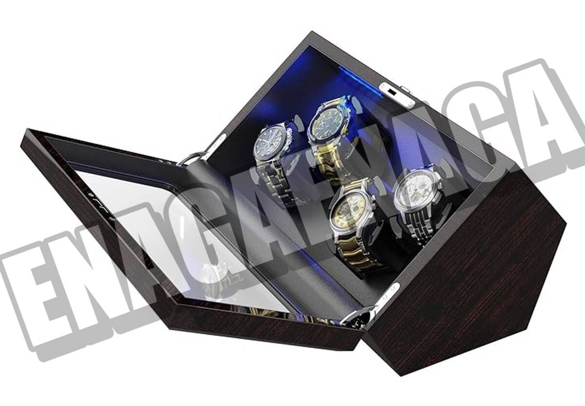 - ワインディングマシーン 4本巻き 松樹皮色 腕時計自動巻き器 ウォッチワインダー LEDライト付き 高級感 静音 4段階設定モード
